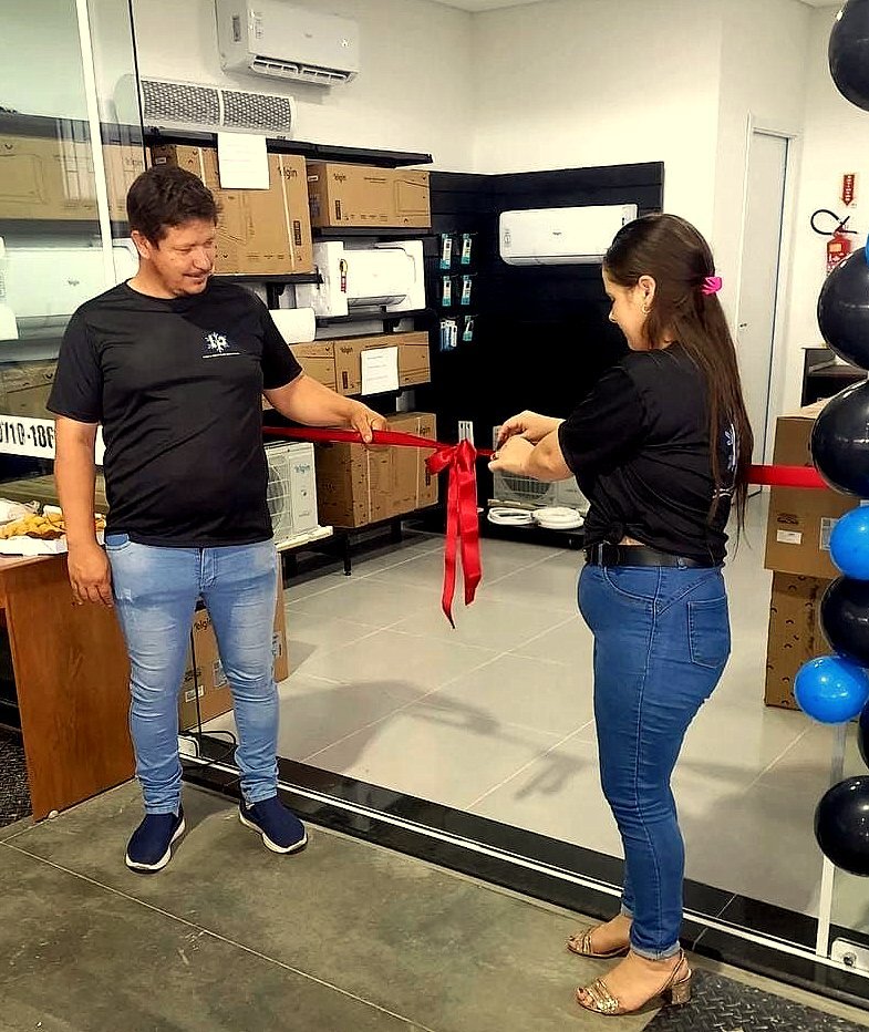 O casal de proprietários, Guto e Juliana Liz, cortando a fita inaugural da Loja do Profissional